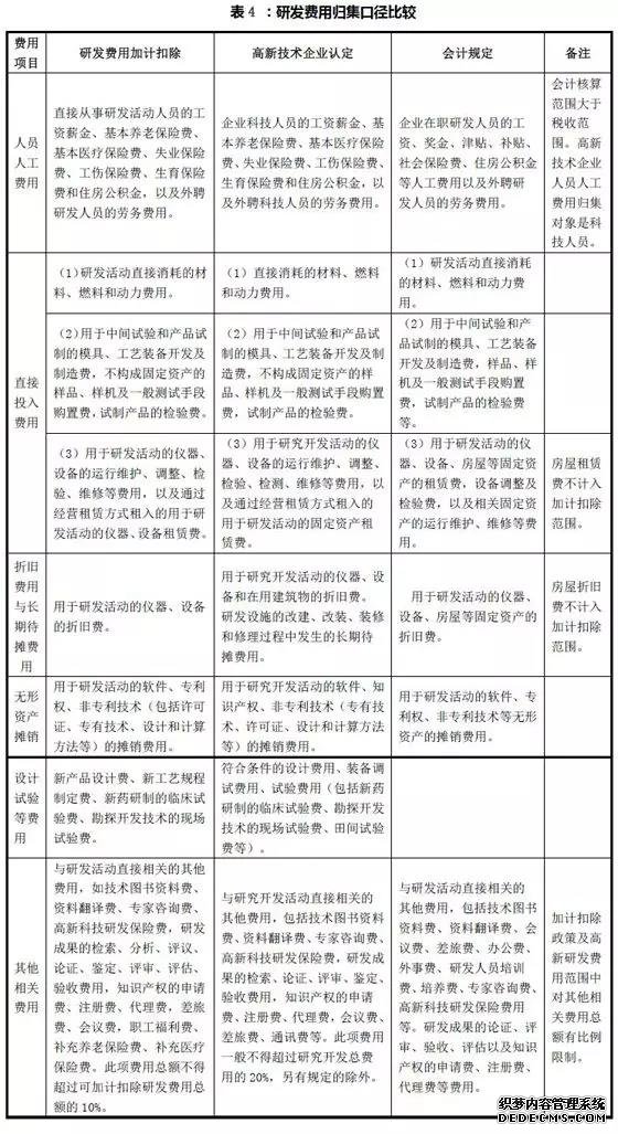 三是研發費用加計扣除政策口徑的研發費用,其主要目的是為了細化哪些研發費用可以享受加計扣除政策,引導企業加大核心研發投入,因此政策口徑最小。可加計范圍針對企業核心研發投入,主要包括研發直接投入和相關性較高的費用,對其他費用有一定的比例限制。應關注的是,允許扣除的研發費用范圍采取的是正列舉方式,即政策規定中沒有列舉的加計扣除項目,不可以享受加計扣除優惠。